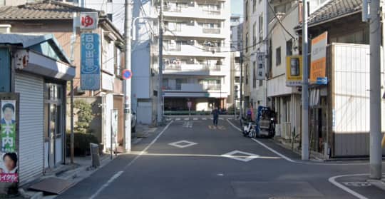 その路地を右に曲がって、十字路2本目まで真っすぐ進んでください。