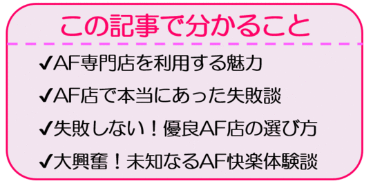 実際に、私のお友達でAF専門店で働いている嬢がいます。普通の風俗店よりも、お給料が少し高いので働いていますが、AFは未経験なので、AFはNGにしているそうです。
