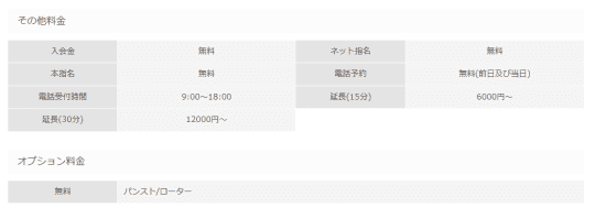 こちらのコースは、「通常コース70分20,000円~6時間120,000円」「SPECIALコース70分23,000円~6時間123,000円」「A.S.Kコース詳しくは問い合わせ」の3本立てで、オプションはパンスト・ローターのみで無料です。