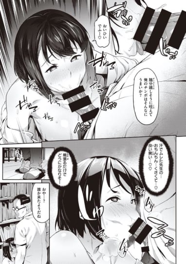 乳首を摘ままれ、汚いおっさんのムレた汗臭い匂いに脳を溶かされ、恋人にキスするようにおちんちんに吸い付きます。フェラをしていると、後ろから後輩くんの声が聞こえてきますが、先生はフェラと辞めさせるつもりはなく、逆にそのままおちんちんを口に突っ込みイラマチオさせます。