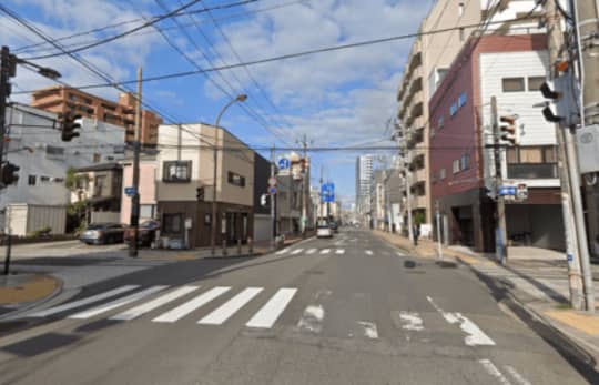 横断歩道を渡ったら、左に曲がり暫く真っすぐ進んでください。