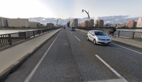 川を越え終わるとこのような交差点が見えますが、ここもひたすら道なりに真っすぐです。