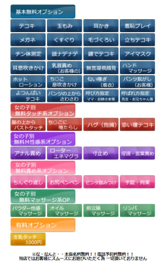 基本無料オプションは「手コキ」「玉もみ」「耳かき」「恥辱プレイ」「メガネ」「くすぐり」「毛づくろい」「立ち手コキ」「チン体測定」「頭ナデナデ」「鏡で手コキ」「アイマスク」「耳息吹きかけ」「乳首責め(客)」「無言疑視顔見」「ハンドマッサージ」「ホットローション」「ちんぽ息吹きかけ」「匂いかぎ(着衣)」「パンツ脱がし(客)」「四つん這い手コキ」「パンツの上からサワサワ」「呼び方指定(ママ・お姉さま等)」「呼ばれた方指定(先生・お兄ちゃん等)」と、かなりバラエティー豊富な基本オプションとなっており興奮間違いなしです。