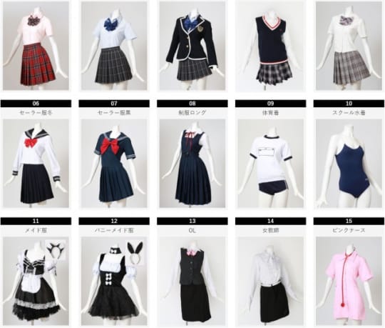 定番の制服系から、ラムちゃんやエヴァ制服などのコアなコスプレまで女の子とのプレイを盛り上げてくれる衣装が満載です。