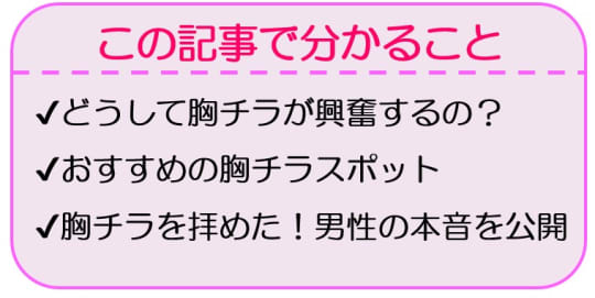 - Q胸チラはどこで遭遇しやすいですか?Aバスや電車、公園など人が集まりやすくしゃがむ頻度が高い場所では胸チラに遭遇しやすいでしょう。