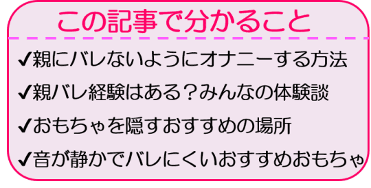 - Q親にバレずにオナニーするには?A親の不在時にするのが一番です!スーパーなどの用事などではなく、確実に帰宅しなさそうな予定の時にする方が安心できます。