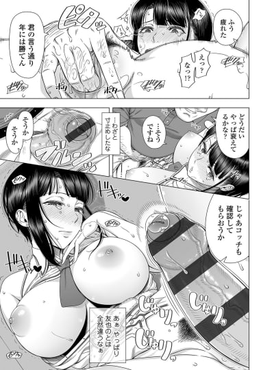 女性の嫌がる表情と、口でコンドームをつけるというどエロい行為が相まって最高に抜けるシーン。ゴム越しでもめちゃくちゃきもちよさそうな描写が最高です。また、女性が旦那や友達に謝罪しているところも背徳的でグット。