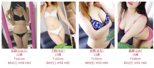 モデル体型でしかも美乳の女の子が多い!レベルがとても高い印象です。年齢は18歳~30代前半と幅広いため、自分好みの年齢の女の子に出会えて遊べるのも良いですよね。