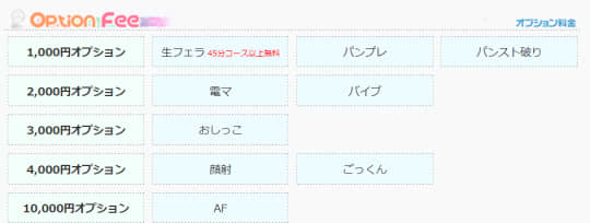 オプションは「1,000円:生フェラ(45分コース以上無料)・パンプレ・パンスト破り」「2,000円:電マ・バイブ」「3,000円:おしっこ」「4,000円:顔射ごっくん」「10,000円AF」となっています。