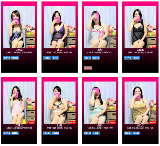 その中での40代半ば~50代半ばが中心層で、スタイルはぽっちゃり系中心で、ビジュアルは極端な美人の在籍はありませんが、個々に愛嬌のある個性的な魅力を持つ女性ばかりです。