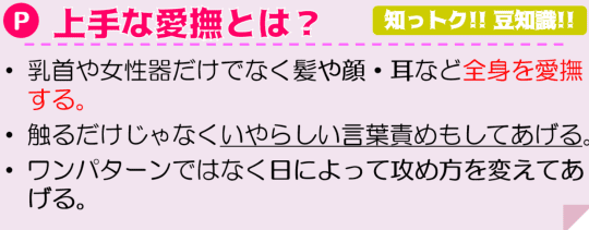キスをしたり、乳首・首筋・背中・太もも、色々なところを愛撫しながら、女性をゆっくり虐めてみてください。