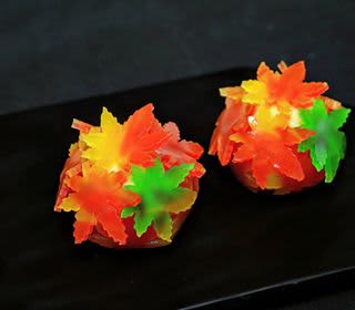 ご覧いただいてすぐお判りのように、赤や黄色の色合いといい、もみじの形といい、このひとつの和菓子に綺羅錦秋の京都が大変よく表現されています。
