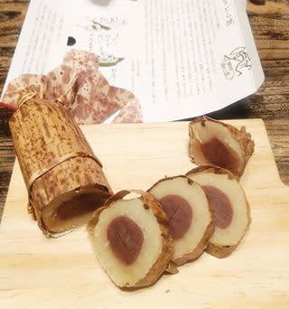 こちらは棹菓子の【錦秋】。栗を練り込んだ羊羹で、紅葉狩り同様「秋」を存分に表現しています。