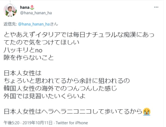 とにかく、イタリアまで行って性被害にあうとは、なまじぶっかけ痴漢だっただけにはらわたが煮えくり返るような屈辱でした。