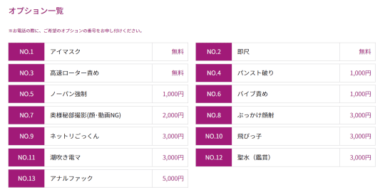 オプションは、「無料:アイマスク・ローター・即尺」「1,000円:ノーパン強制・バイブ責め」「2,000円:奥様秘部撮影(顔・動画NG)」「3,000円:ぶっかけ・ねっとりごっくん・飛びっ子・電マ・聖水」「5,000円:AF」で、AFが5,000円と良心的でポイント高いです。