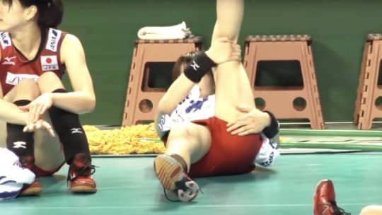 画像は足を上げてストレッチをしている方が木村沙織さんです!