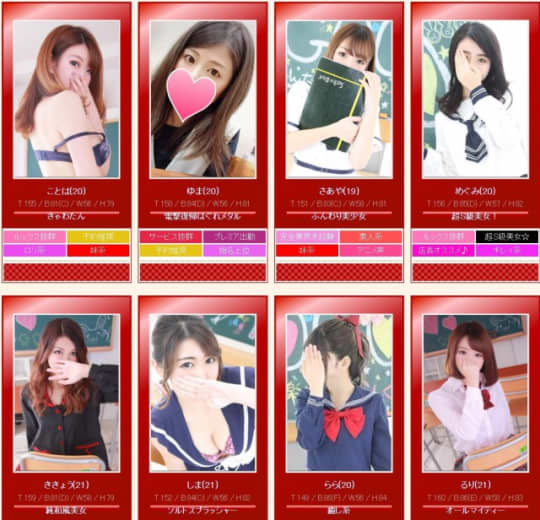 学校でゴー!ゴー!では、お店のコンセプトに合った制服の似合う若い女の子が勢ぞろいしています。