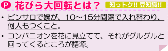 女性を花びらに見立てて、次々と回転(入れ替わる)ことで花びら回転と呼ばれるようになりました。