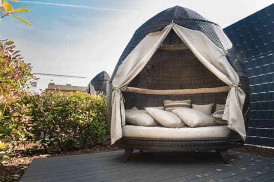 加えて、庭横に設けられた休憩スペースにはリクライニングソファーが沢山置かれており、そこで少し休むことができます。