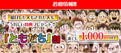 紹介された人も、した人も「ともだち割」で1,000円OFFになったり、3と9の付く日は1,000円割引といったのもありますね。