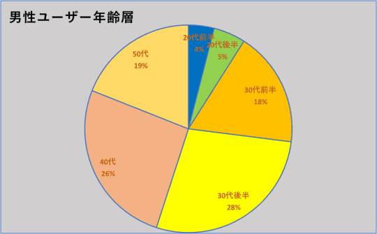 女性の年齢層から打って変わって、男性ユーザーの登録年齢層で多い世代は30代後半〜40代です。
