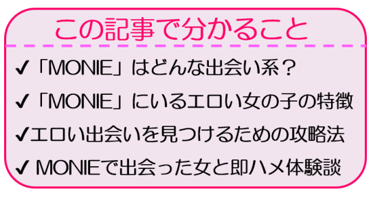 今回は、エロい出会いを求めている男性に最適な「MONIE」の実態に迫っていきます!