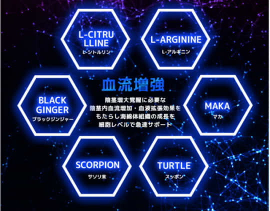 L-シルトリン | 体内に吸収されると一酸化窒素が生成され、 ペニスの海綿体に血流を促す。勃起機能向上が期待できる。 |