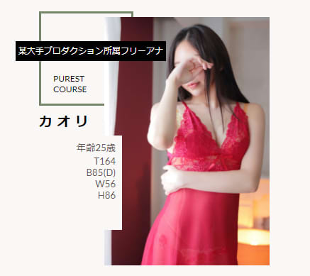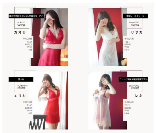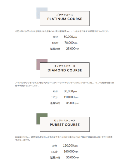予算の関係で私もこのコースは未体験ですが、「PLATINUM COURSE」「DIAMOND COURSE」の所属女性を見ても早々たる経歴のメンバーなので、「PUREST COURSE」は驚くような女性が登場することでしょう。
