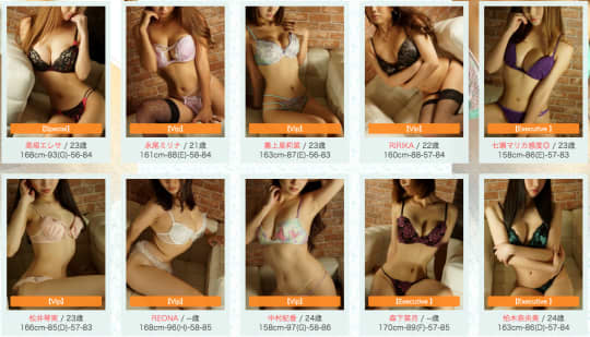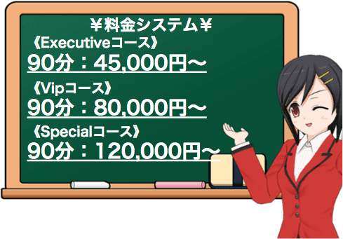 まず女の子によって、「Executive」、「Vip」、「Special」の3つにランク分けされていて、それぞれ基本料金が違い、時間は90分から選べます。