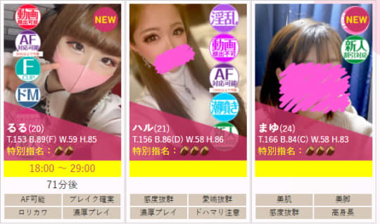 動画撮影(顔出しNG)やAFが可能の子も多く、自分好みのプレイを楽しむことが出来ますよ!