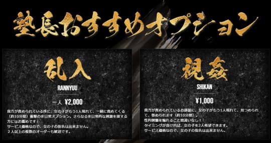 こちらは、痴女がフィニッシュときに「男の潮吹き」や「ドライオーガズム」と言った性感帯を開発するM性感店ですが、これらのオプションや、ペニバンなども組み合わせて最高の時間を過ごしましょう。