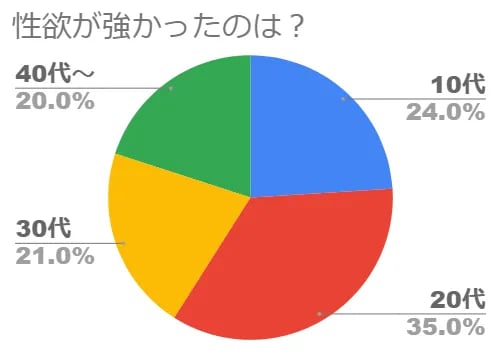 世間では特に女性は40代~性欲が上がる!なんて言われていますが、意外にも男女共に20代が一番多い結果となりました。