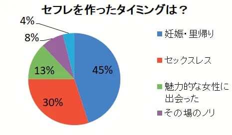 20~50代の既婚者男性に『セフレを作るタイミングは?』と、Trip-Partner独自のアンケートを実施したところ、上記のグラフ結果になりました。