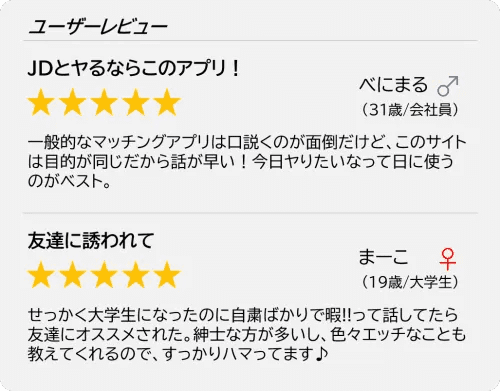 掲示板では老舗出会い系サイトだからこそ、ヤリモク女子の定番サイトとなっています。特に若い世代の利用が集中しているので、開放的なノリの良い女性が多数登録!