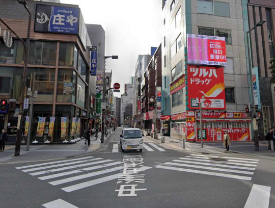 2つ目の信号を渡ると、右手に見えるオレンジのビルの一階に、無料案内所があるので、ここの路地に入りましょう。お店まではもうすぐですよ。