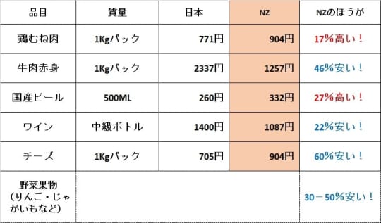 「日本とニュージーランドの物価比較」では、以下のように集計されています!