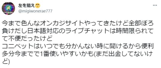 Konibet(コニベット)は24時間日本語でのサポートをしてくれるので、とても心強いんです。