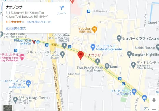 ↑ナナプラザの場所はこちら。世界一下品な通りと称されるスクンビットのBTSナナ駅から歩いてすぐの場所にあります。周囲にはタチの悪い街娼が大勢いるので気をつけて!