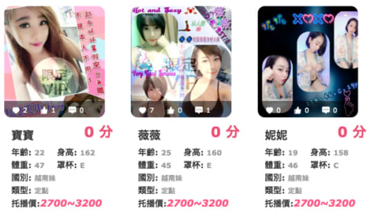 例えば写真左上の子はベトナム人ですが、お値段はショートタイム2700ニュー台湾ドル(約1万円)。ちなみにノースキン希望ならプラス500ニュー台湾ドル(約2000円)とのこと。これらの相場観から大きく外れる値段を提示されたら怪しんだ方がいいです。例えば「台北のピンポンマンション、外人なら5000ニュー台湾ドルからでございます!」とか。