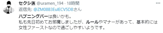 人それぞれの楽しみ方でいいんだと思わせてくれるのが、またハプニングバーの良いところだと私は考えています。
