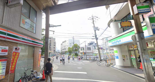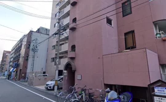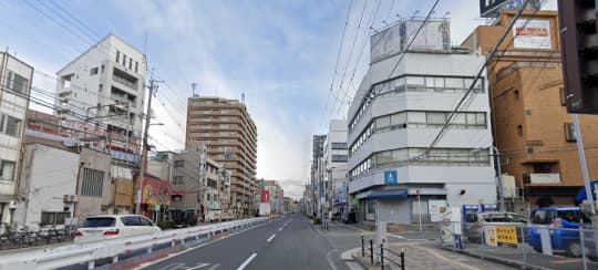 画像真ん中に見える赤い看板があるビル3階が、目的地「コマダム倶楽部十三店」の受付所です。