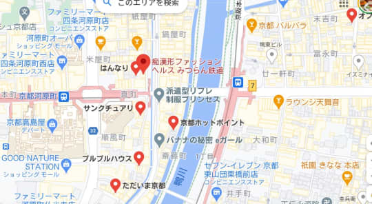 デリヘルが多い京都ですが、その他の風俗エリアは四条河原町周辺に点在しています。