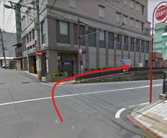 交差点に出ると矢印の方向へ進み、突き当たりを左に曲がります。