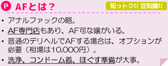- QAF出来るお店は多いですか?AオプションでAFが出来るお店は多いですが、NGな女の子も多いですね。