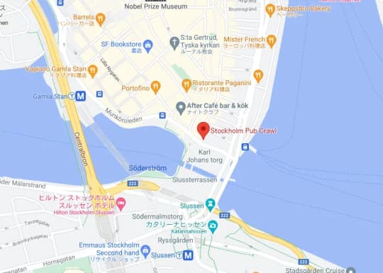 53番線のバスに乗車し、最寄りバス停留所「Kornhamnstorg」で下車すると徒歩5分の距離で、Stockholm Pub Crawlへと到着します。