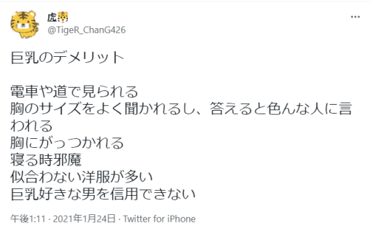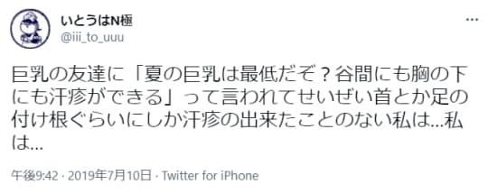 「巨乳は悩みがいっぱいで辛いことばかりだよ」って女友達に言ったら「嫌味?」って言われた。