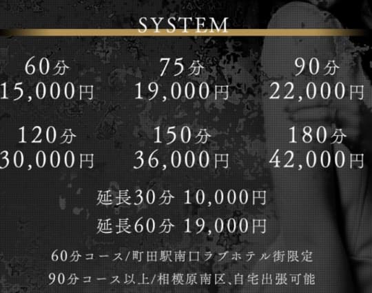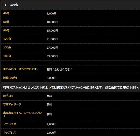 料金 | 30分3990円〜 | 60分14000円〜 | 40分8000円〜 | 60分9000円〜 | 70分10,000円〜 | 60分17,000円〜 |