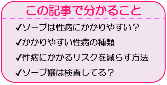 しかし、「ソープでは本番行為もあるみたいだし、性病になりやすいのかな」という不安をお持ちの方も中にはいるでしょう。