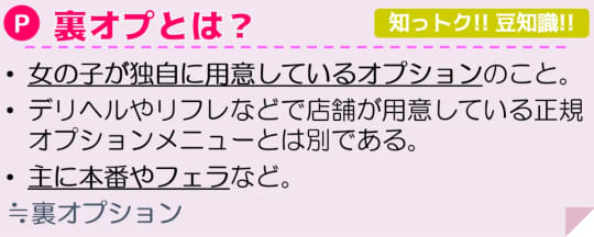 裏風俗とは、禁止行為である本番を行っている風俗店、もしくは営業許可の届出を出さず性的サービスをしているお店のこと。いわゆる違法店です。(ソープランドを除く)