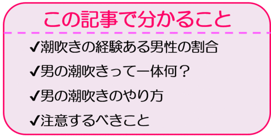 男性でも女性と同じように、潮吹きが出来ることはご存知でしょうか?ここでは、男の潮吹きのやり方や注意点などを詳しく解説しています。男の潮吹きを成功させたい方の為のオススメなやり方や実際に私が試してみた方法などもありますので、是非参考にしてくださいね。